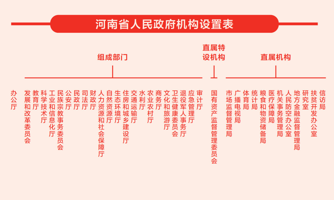 河南省人民政府设置工作部门36个。 其中,办公厅和组成部门23个,直属特设机构1个,直属机构12个。 办公厅挂参事室、港澳事务办公室牌子; 水利厅挂移民办公室牌子; 商务厅挂外商投资管理局、中国(河南)自贸区工作办公室牌子; 卫生健康委员会挂中医管理局牌子; 市场监督管理局挂知识产权局牌子; 地方金融监督管理局挂金融服务办公室牌子。 此外,设置部门管理机构6个。 其中,大数据管理局由办公厅管理; 能源规划建设局由发展和改革委员会管理; 监狱管理局由司法厅管理; 林业局由自然资源厅管理; 文物局由文化和旅游厅管理; 药品监督管理局由市场监督管理局管理。