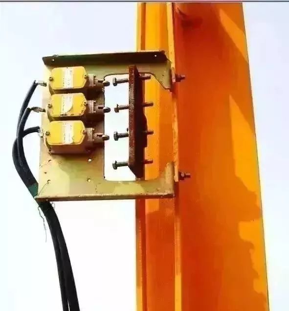 对轨道运行式塔吊,每个方向应设置运行限位装置,其中包括限位开关、缓冲器和轨道终端挡铁。开关动作后应保证塔吊停车时其端部距缓冲器最小距离为1m。终端挡铁距缓冲器最小距离1mm。