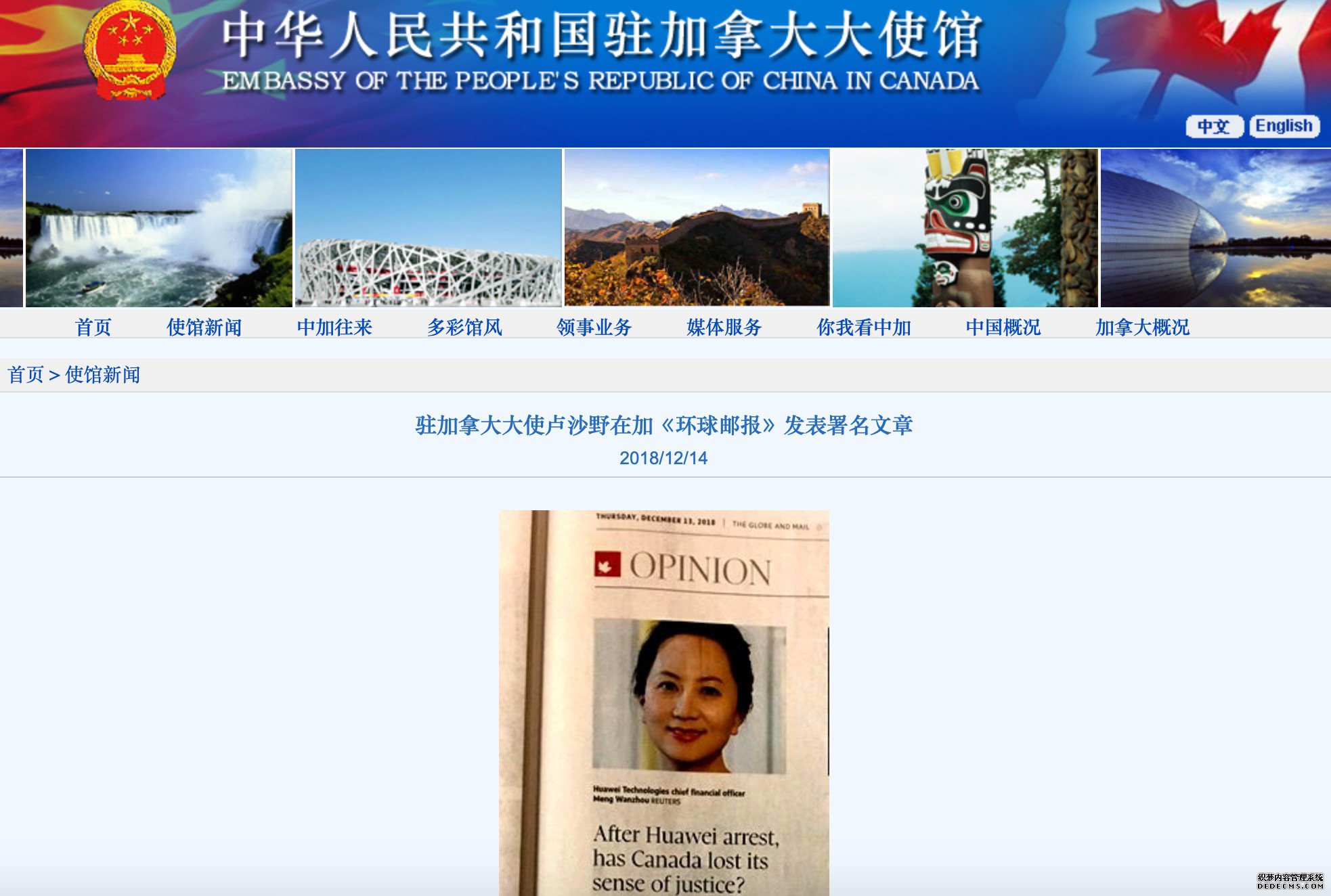 2018年12月13日,中国驻加拿大大使卢沙野在加《环球邮报》发表题为《我们不希望看到加拿大走上背离公平正义的道路》的署名文章。全文如下: